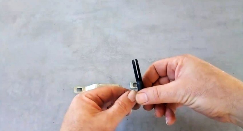 От полосы необходимо отрезать заготовку длиной 6-7 см. Со смещением под один край в ней просвечивается отверстие под болт.