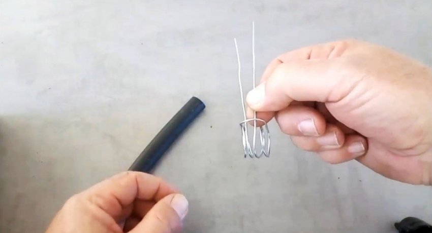 Заготовка снимается и сгибается пополам, чтобы сложить кольца вдвое. Здесь важно загнуть проволоку без острого угла. Далее хомут натягивается на шланг.