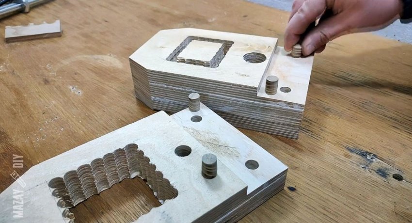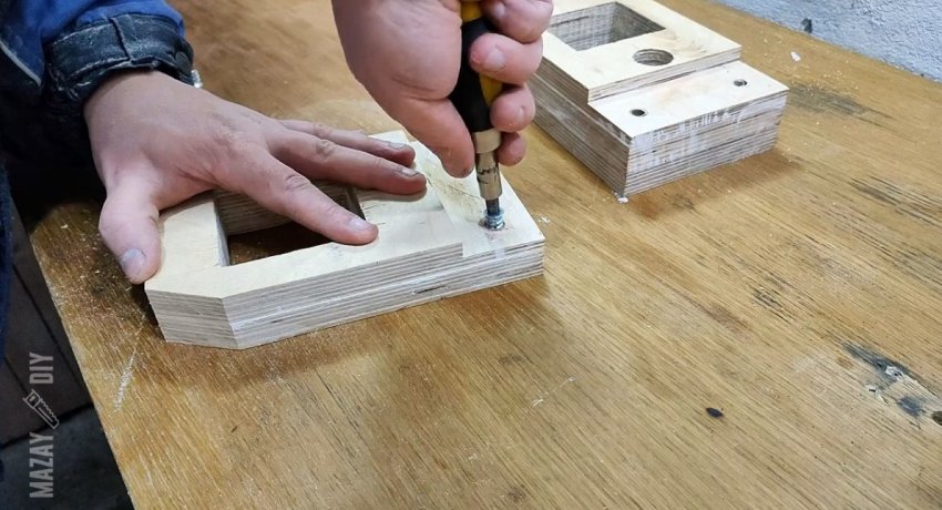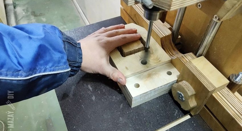 Далее нужно проделать квадратное отверстие под планку. На трехслойной детали необходимо просверлить 2 слоя. Это будет подвижная губка. Двухслойную заготовку требуется просверлить насквозь.