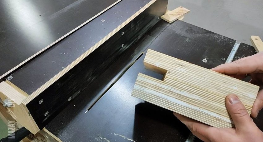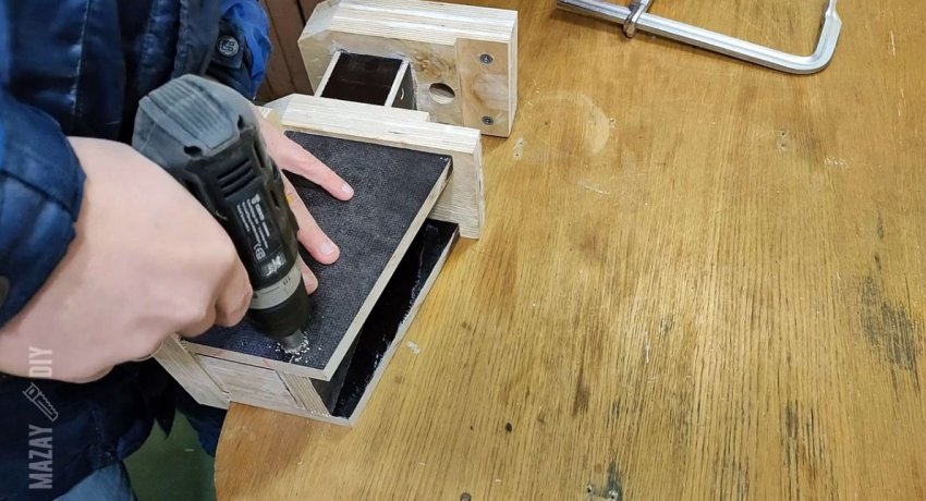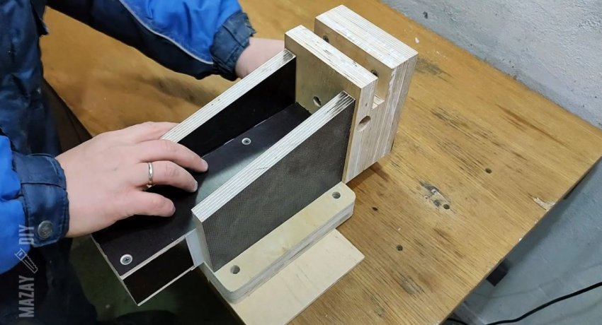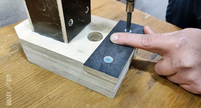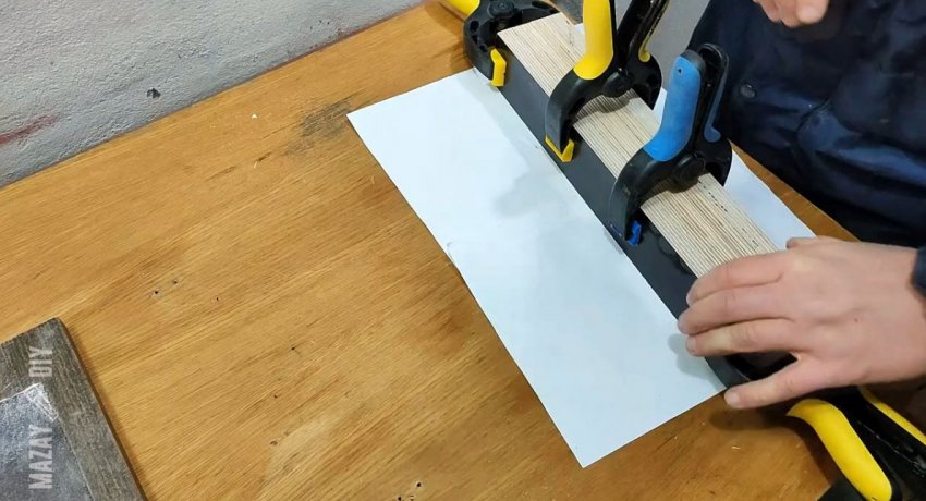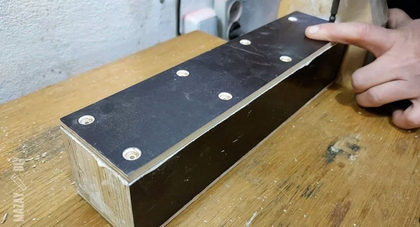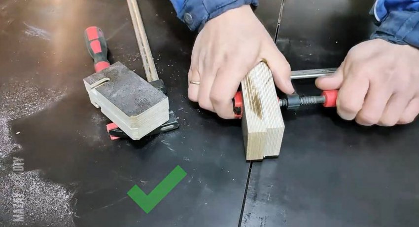 На боковую часть планки приклеиваются 2 накладки из тонкой ламинированной фанеры 6 мм размером 314х72 мм. Также нужно просверлить сбоку неподвижную губку напротив отверстия для винта, чтобы вставить в нее цилиндр с резьбой для его вкручивания.
