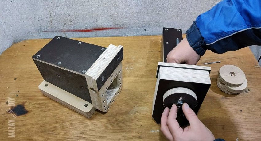 Диски укрепляются саморезами, и через боковое отверстие заводится рукоятка из стального кругляка 14 мм. Чтобы тот не выпадал, на его концы вклеиваются ограничители.