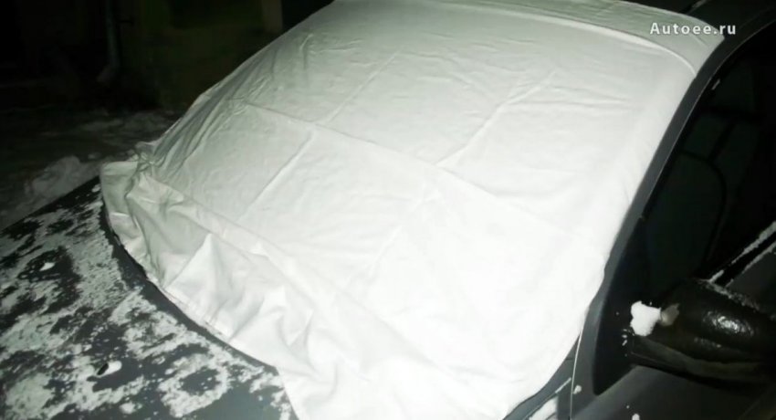 На ночь можно накрывать стекло старой простынкой, поджимая ее с боков дверьми. Это позволит защитить только лобовое стекло, но заднее и боковые все равно будут в наледи, поэтому этот метод лишь полумера. К тому же замерзшую ткань будет сложно загнуть и сложить. Ее придется перекладывать в салон или багажник, а это ненужная сырость.