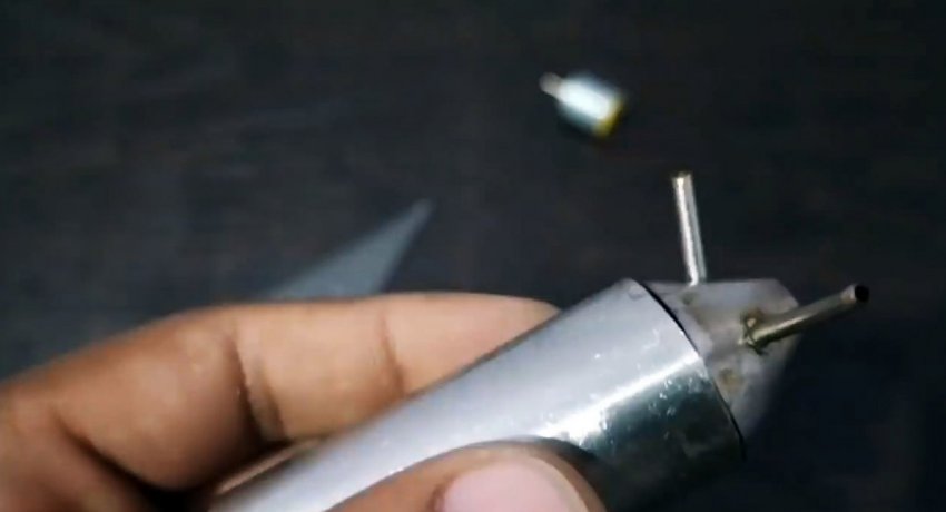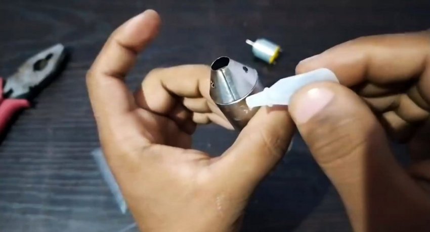 Теперь при нажатии кнопок на зажигалках газ из них поступит в конус реактивного двигателя, где его нужно поджечь. Затем при запуске поддува воздуха появится тяга. Она будет продолжаться пока не отпустить зажигалки.