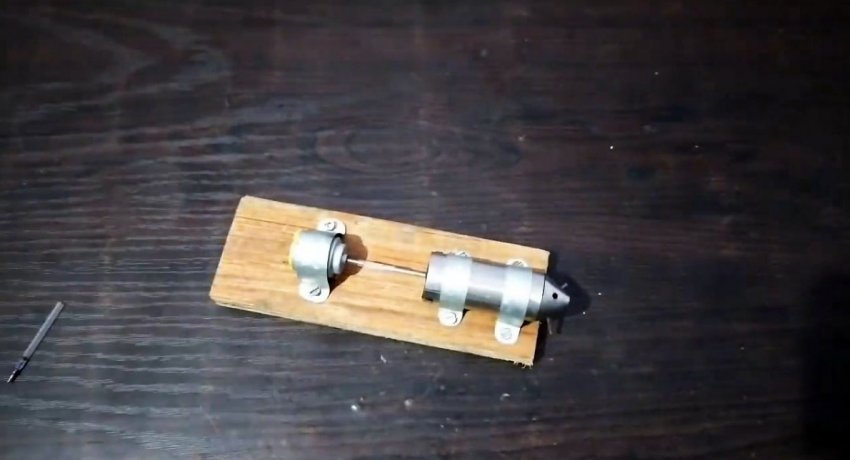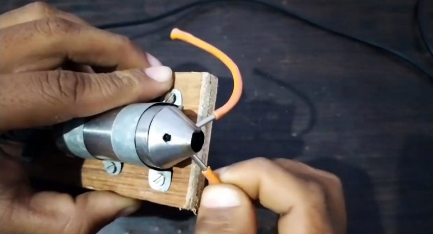 Двигатель прикручивается к деревянному основанию скобами из листового металла так, чтобы отверстие в конусе без трубки было вверху. Аналогично на подошву крепится электродвигатель. Его ось соединяется с реактивным мотором посредством стержня от ручки.