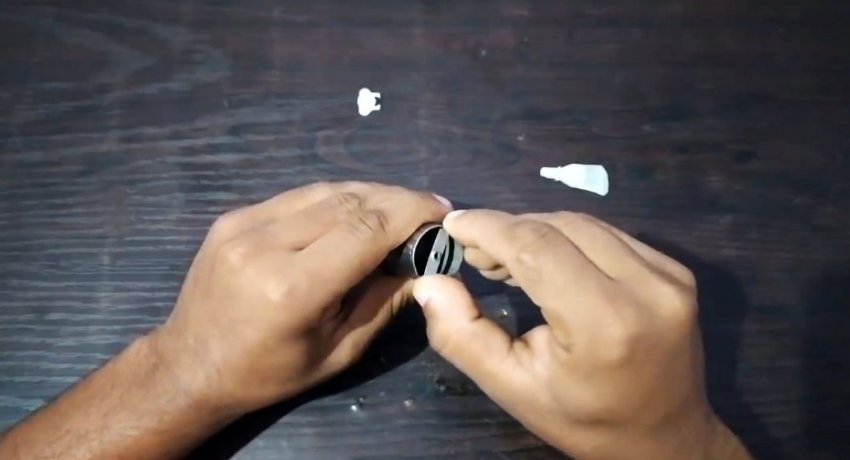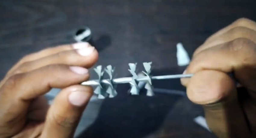 Далее берется кусок велосипедной спицы длиной 70 мм. На него надеваются крыльчатки. Чтобы их закрепить, используется клей и втулки с разрезанного на куски пустого стержня от шариковой ручки.