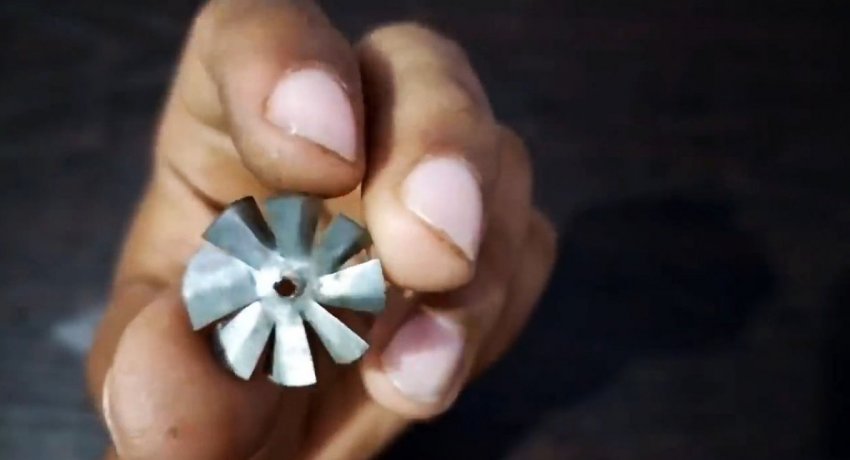 Из тонкого листового металла вырезается 4 диска под внутренний диаметр трубы. Их нужно просверлить по центру, нарезать на них лопасти и выгнуть из них крыльчатки.