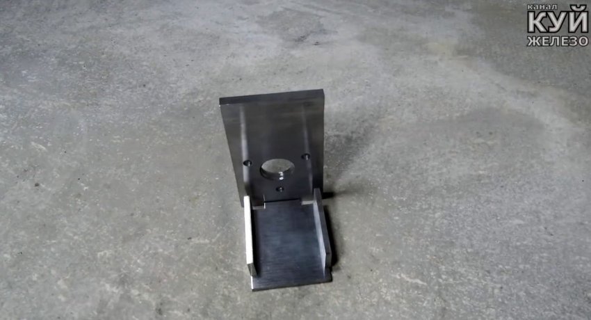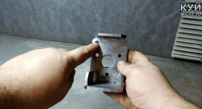 Для начала нужно сделать крепление под редуктор. Для этого потребуется отрезок листовой стали 100х70 мм. В нем по центру просверливаете большое отверстие коронкой под вал редуктора и 3 обычных, для его крепления. Затем вырезаются заготовки: 60х75 мм и 3 шт. 60х30 мм. На большой и одной мелкой нужно подрезать уголки.