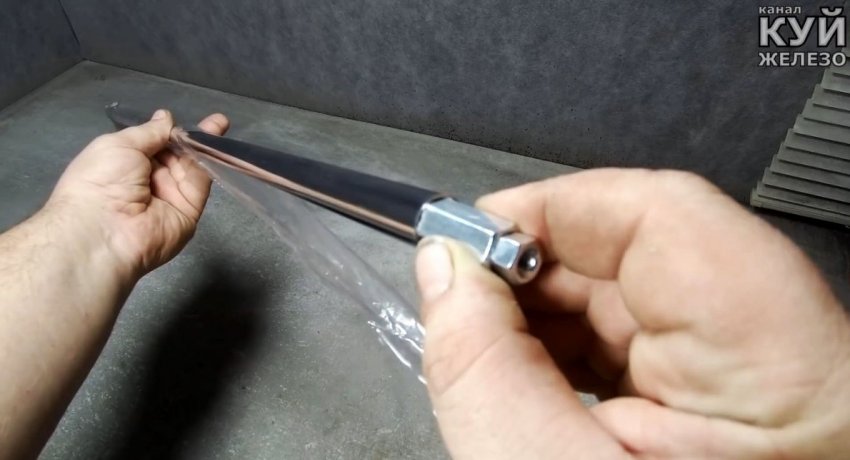 Далее нужно сделать крепление к валу редуктора из обточенной удлиненной гайки М6. Полученная муфта сваривается с гайкой М10. Затем они привариваются к кухонному рейлингу. На второй конец трубки изготавливается острый наконечник.