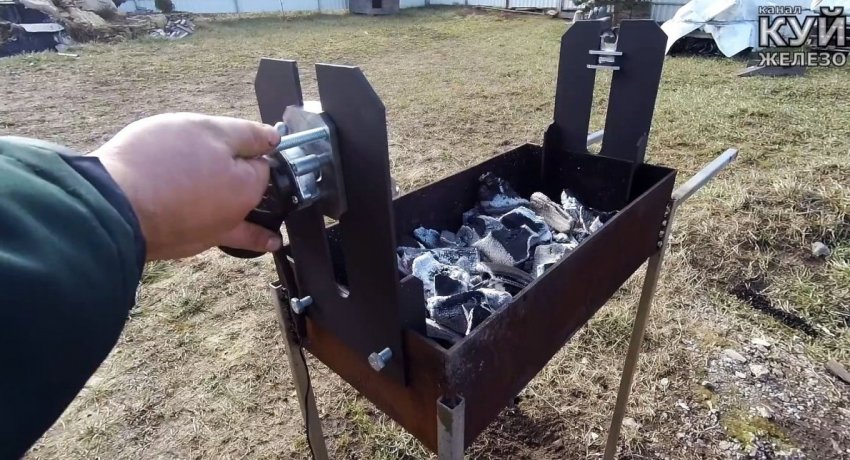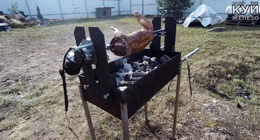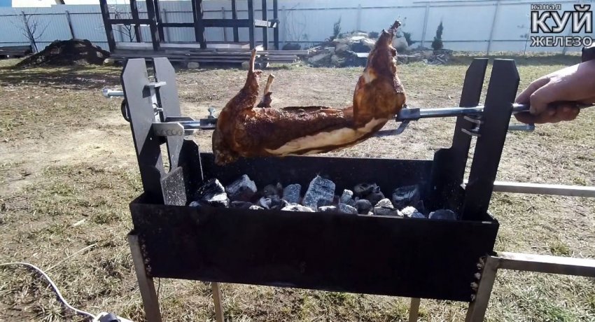Чтобы запечь на мангале целую тушку, ее нужно часто или даже непрерывно переворачивать. Так ничего не пригорит и точно не останется сырым с одной стороны. Чтобы не вертеть шампуром у горячего мангала, можно сделать электрический вертел.