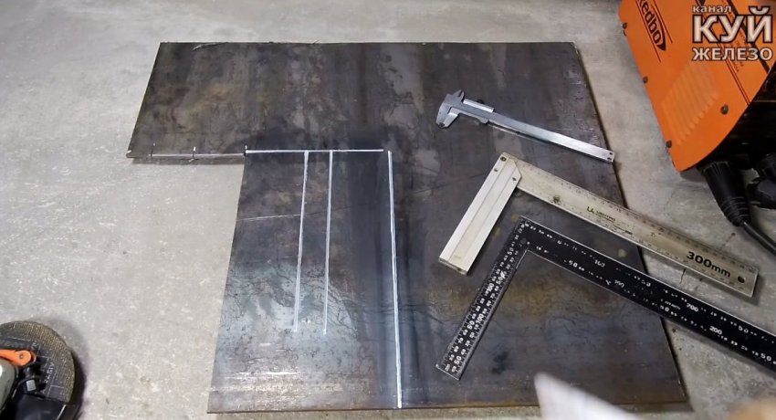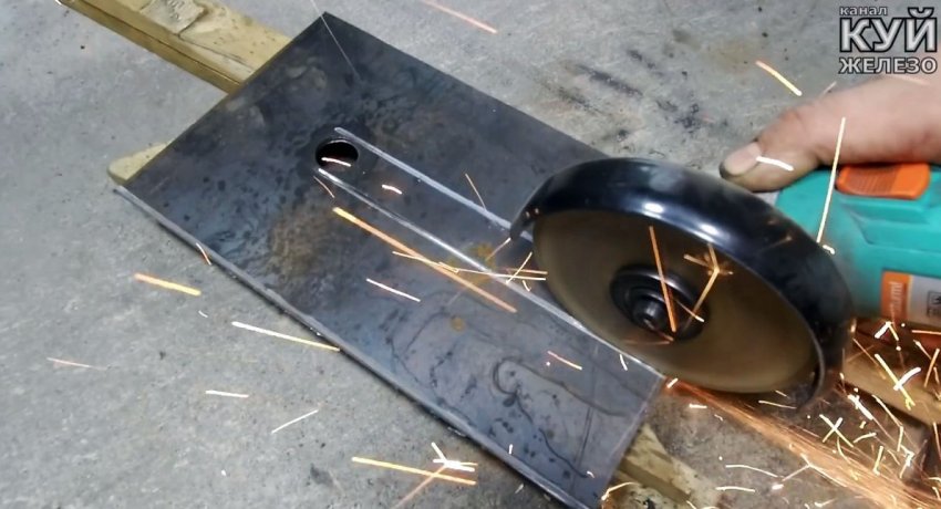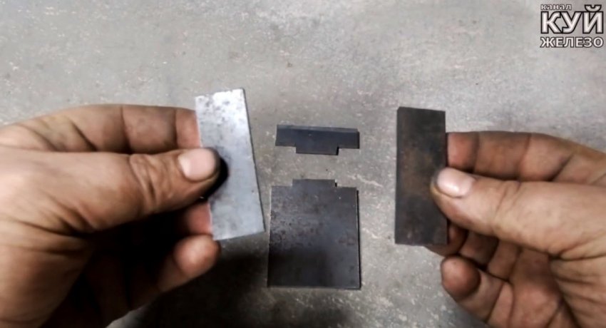 Для второй детали, требуемой для упора шампура, нужно вырезать заготовки 60х50 мм, и 2 – 20х50 мм. С краю большой просверливается отверстие. На мелких срезаются уголки.