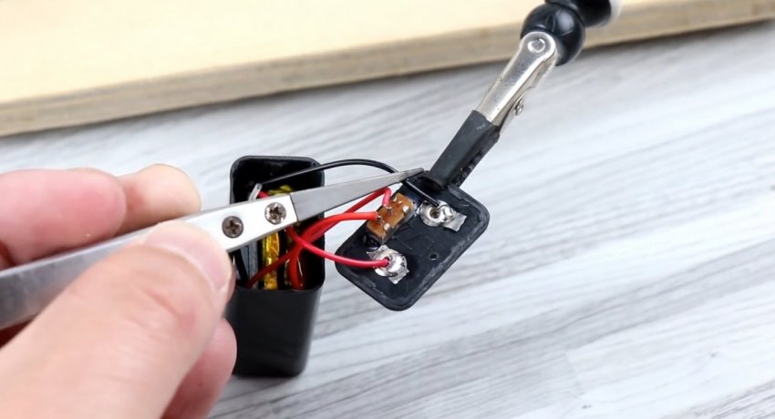 Припаиваем провода к плате. На ней есть все обозначения. От выхода преобразователя припаиваем сразу к колодке, а контакты от аккумулятора припаиваем к аккумулятор только через переключатель.