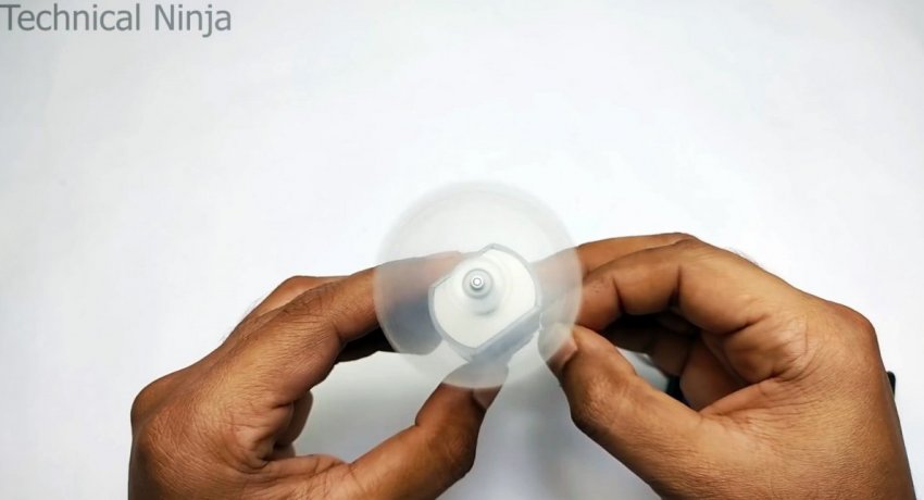 Из листового пластика вырезается передняя заглушка. В ее центре сверлится отверстие под вал ротора.