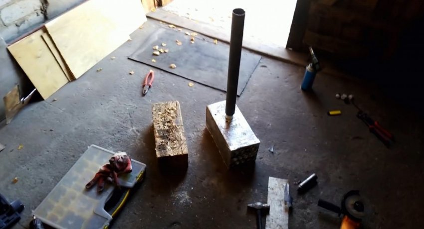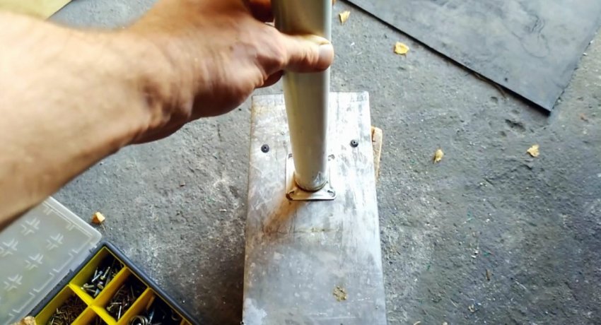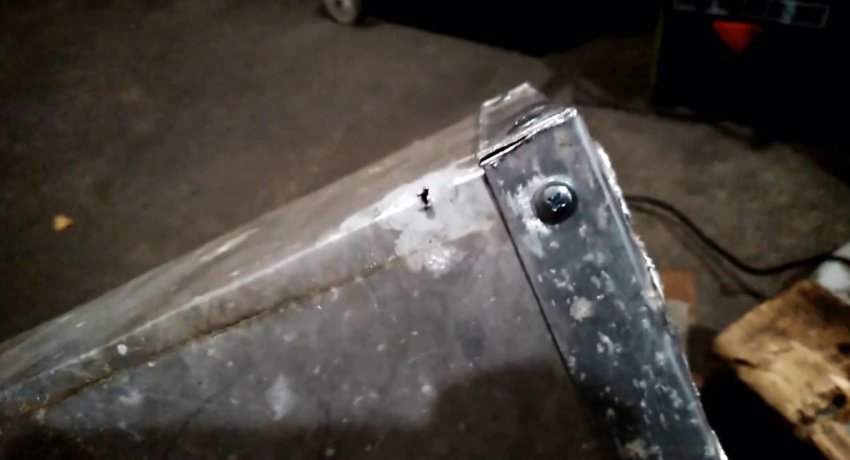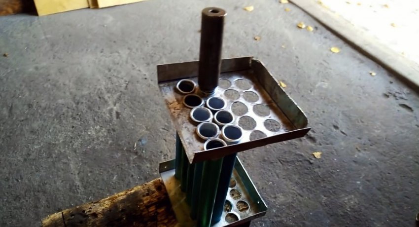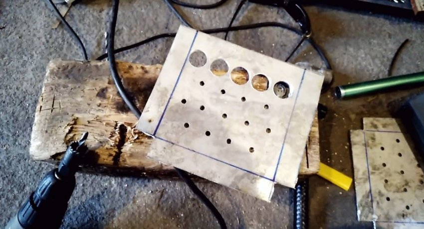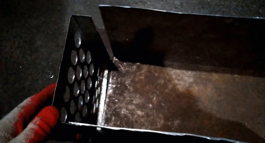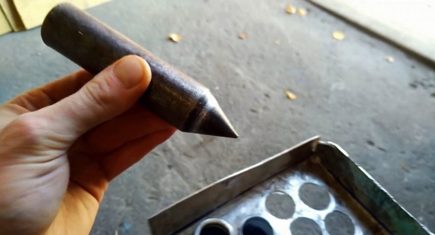 Далее нужно подогнуть просверленные боковины по линиям. В их отверстия вставляются трубки. Чтобы те не выпадали, требуется развальцевать края. Для этого хорошо подходит строительный отвес. Он вставляется в торец каждой трубки и расширяет ее край парой ударов молотка.