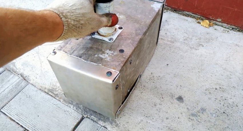 Блок с трубками фиксируется вытяжными заклепками или саморезами в коробе. Для отвода угарного газа нужно сделать отверстие в корпусе и установить на него металлическую трубу. Она будет соединяться с более легкой канализационной трубой 50 мм.