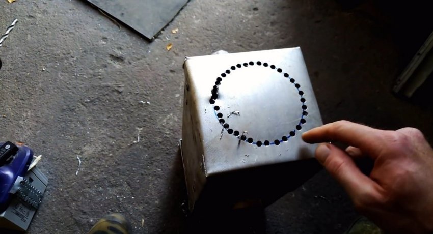 Далее вырезается и устанавливается боковина и часть дна. Оставшегося незакрытого зазора на дне должно быть достаточно, чтобы вставлять портативную плитку. Затем на боковине проделывается отверстие под вентилятор.
