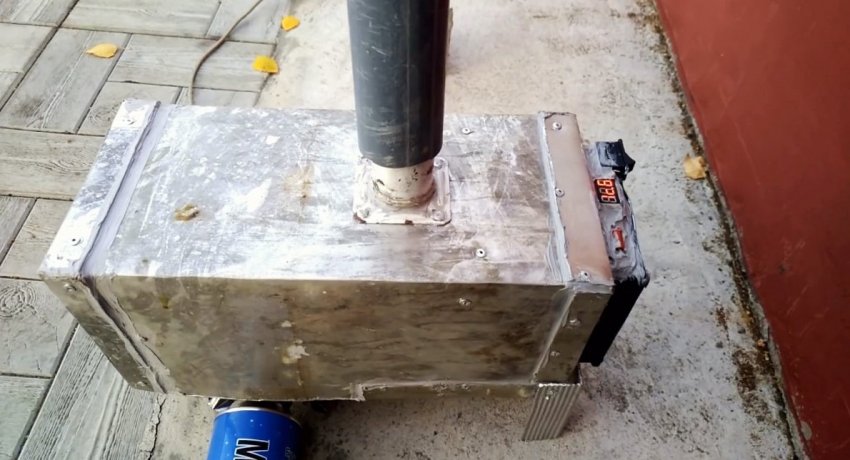 Используя термостойкий герметик, нужно промазать все швы и зазоры, чтобы из теплообменника выходил только горячий воздух, а не угарный газ. Со стороны вентилятора необходимо поставить 2 откидные ножки из уголка. С обратной стороны он будет поддерживаться на самой плитке.