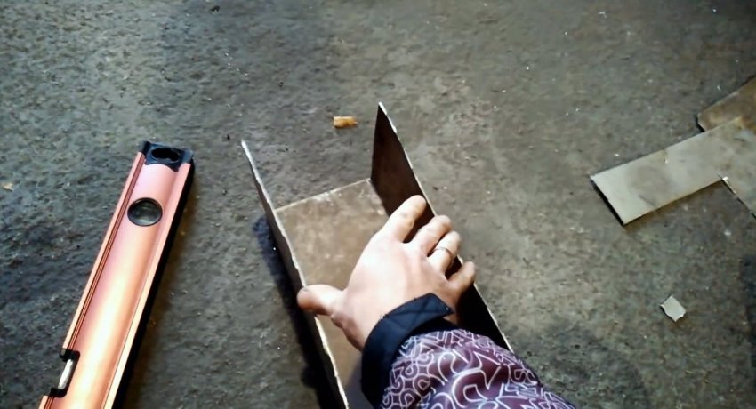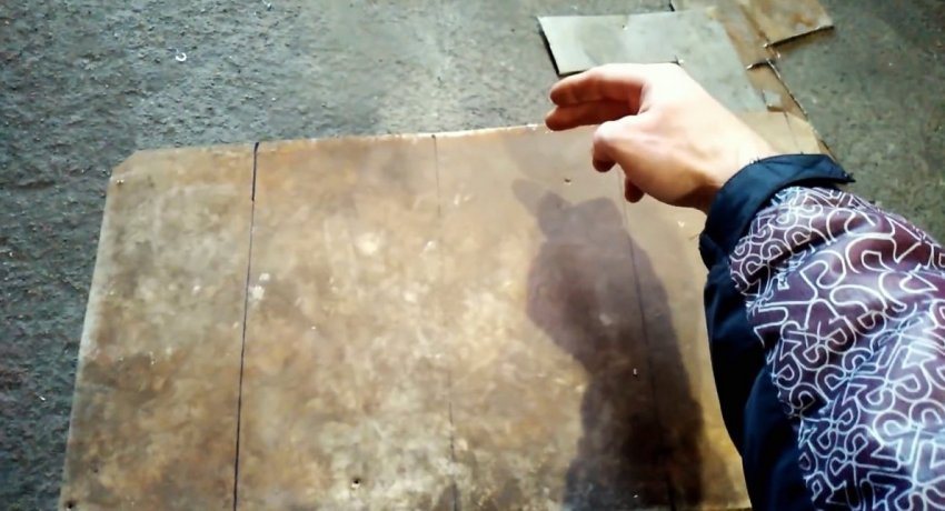 Для корпуса теплообменника необходимо подготовить лист алюминия 30х45 см. С длинной стороны он разделяется тремя линиями на части по 15 см. Нужно сделать загиб по ним, чтобы получить П-образный короб.