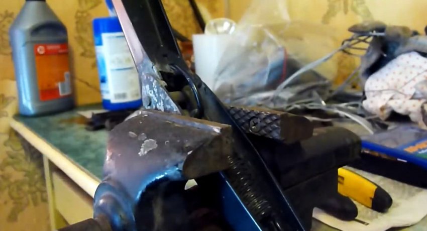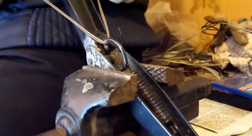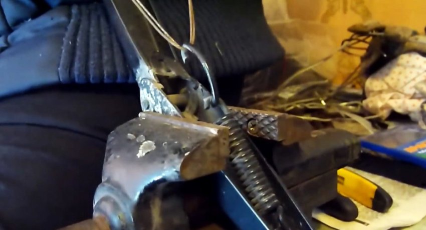 Для усиления прижима нужно подцепить проволокой пружину из обратной стороны поводка. Для этого тот фиксируется в тисках.