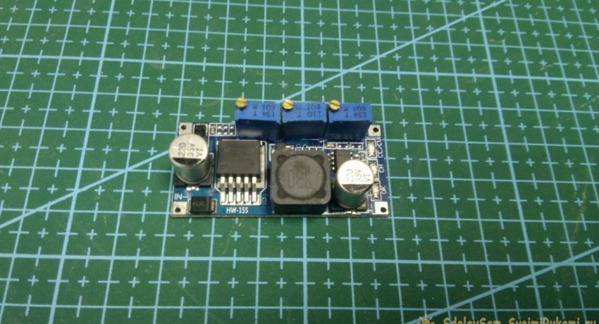 Ее я настроил на 12.6 вольт и ток около 0.5 ампера. Левый резистор - настройка напряжения, правый резистор - настройка тока. Средний резистор - настройка срабатывания светодиода «заряд».