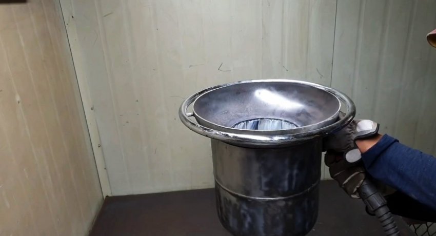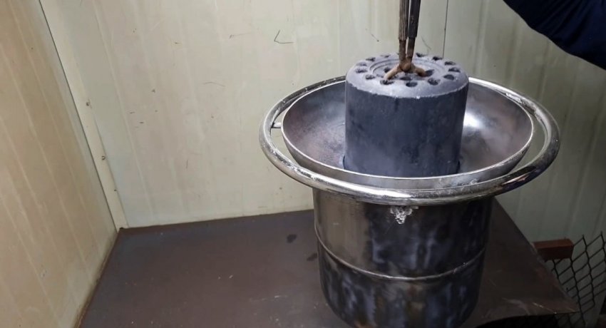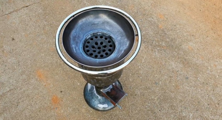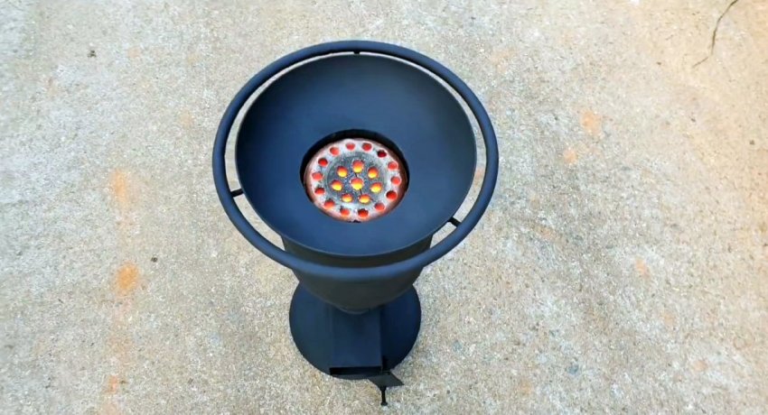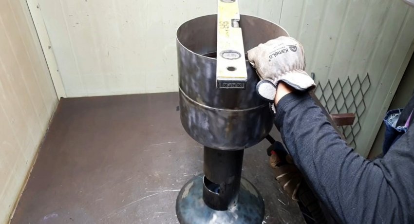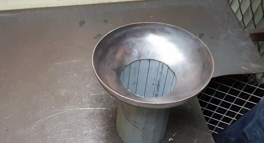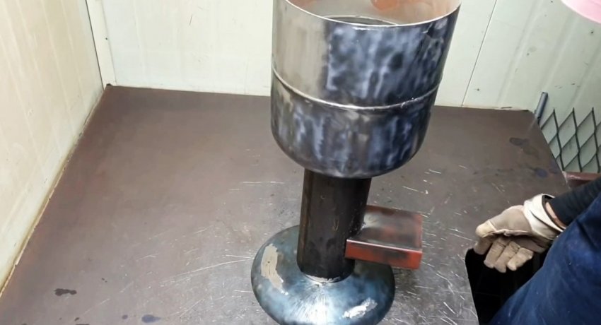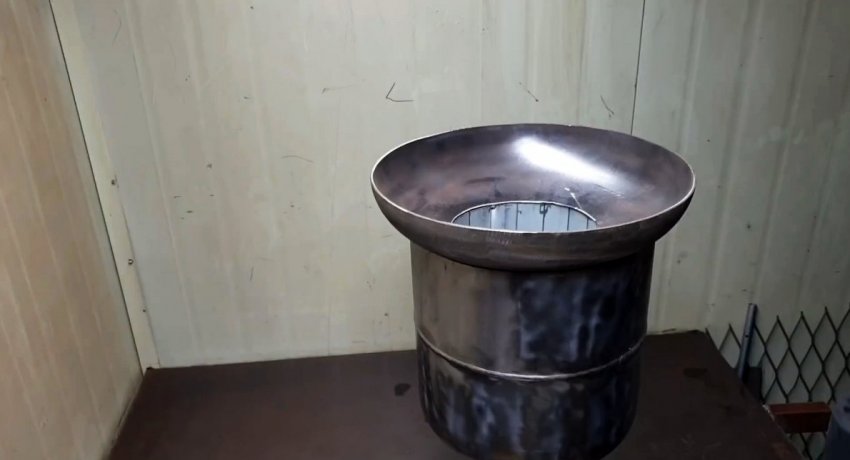 Теперь последняя деталь вставляется в корпус мангала цилиндром вниз, а ее грибок будет использоваться в качестве чаши для готовки. Сам брикет опустится в самодельную трубу.