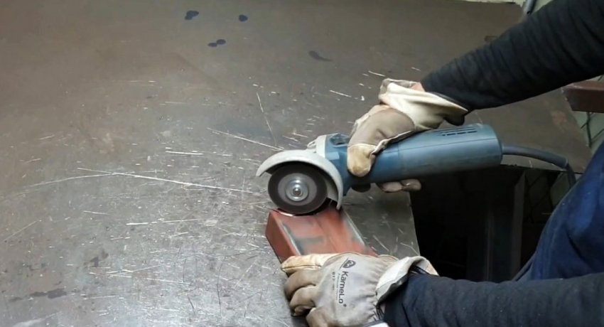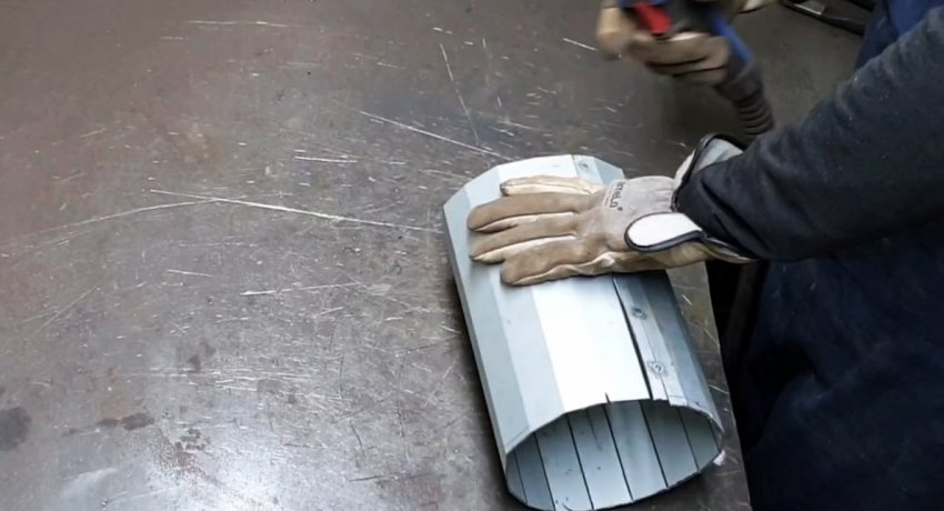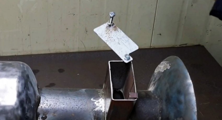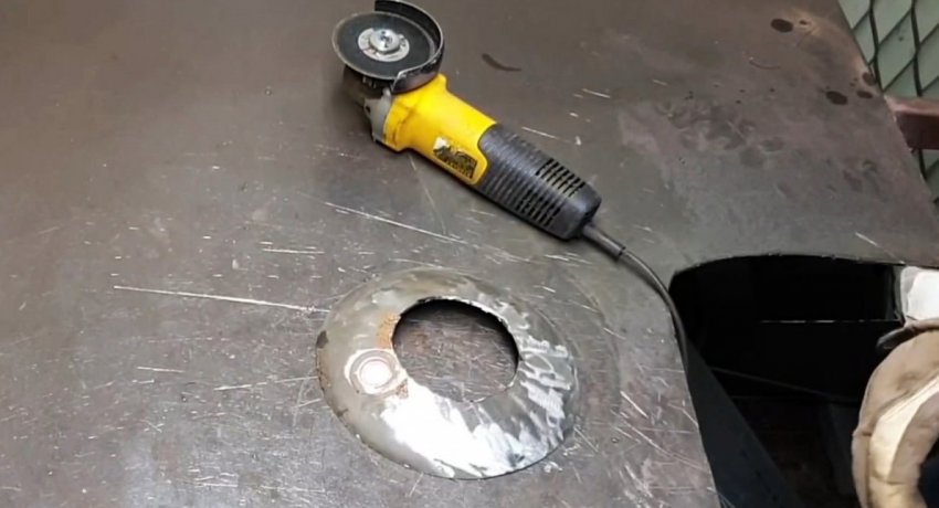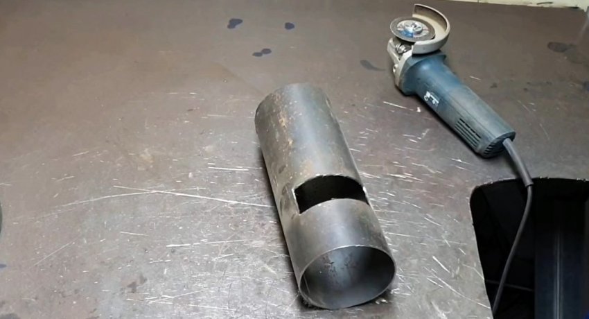 В трубе ближе к одному из краев прорезается окно под большую профильную трубу, что обеспечит подсос воздуха в камеру горения мангала. На ее противоположный конец приваривается ранее срезанная и подготовленная крышка баллона.