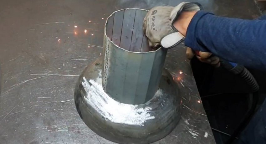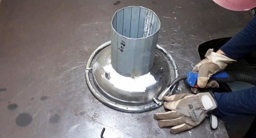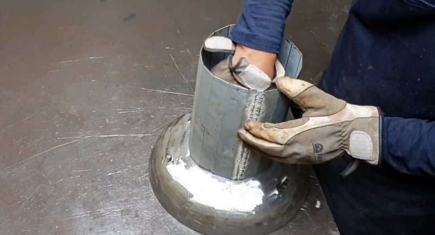Из листовой стали скручивается цилиндр такого диаметра, чтобы в него входил топливный брикет. Его нужно вварить в еще одну крышку или дно баллона, вырезав в ней отверстие.