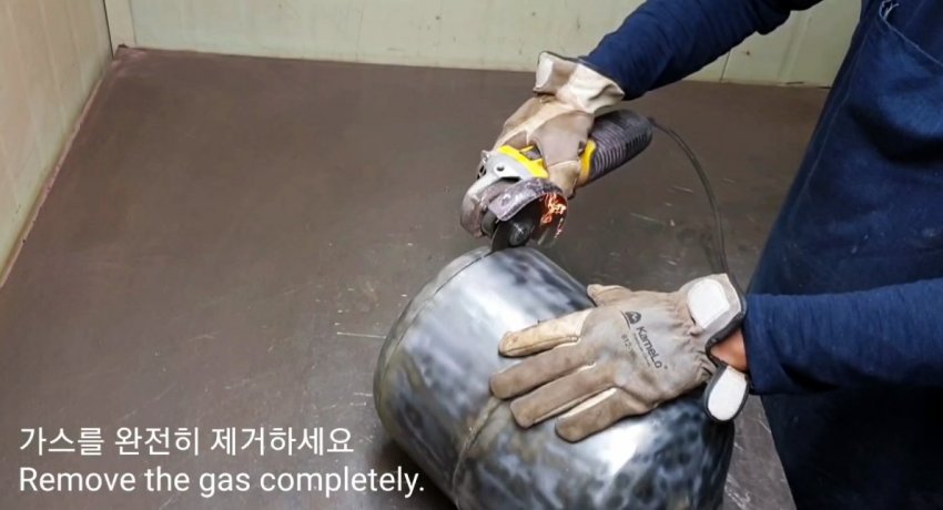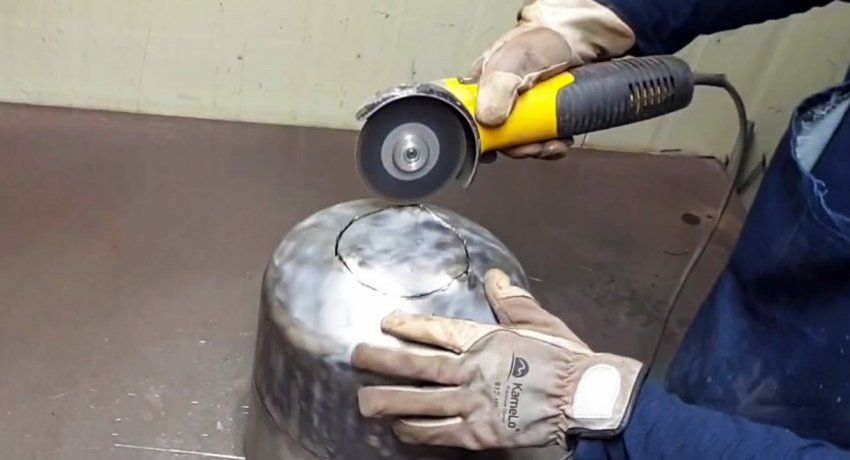 Верхняя крышка баллона срезается. Ее нужно обрезать по краям, чтобы она впритирку входила в него. Также в ней и в дне баллона прорезаются отверстия под круглую трубу.