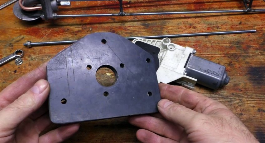 Из толстого пластика вырезается переходная плита для крепления мотор-редуктора к каркасу.