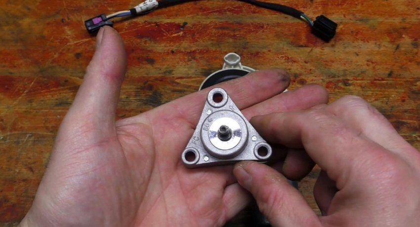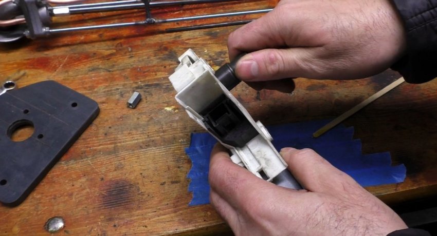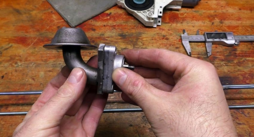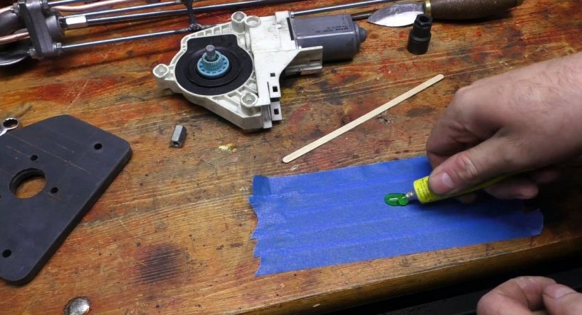 Далее нужно оснастить вал стеклоподъемника переходником под внутреннюю резьбу М6, чтобы соединиться со шпилькой, идущей от насоса. Для этого на его шестерню вклеивается эпоксидной смолой трубка или часть форсунки. Сверху на нее приваривается удлиненная гайка М6.