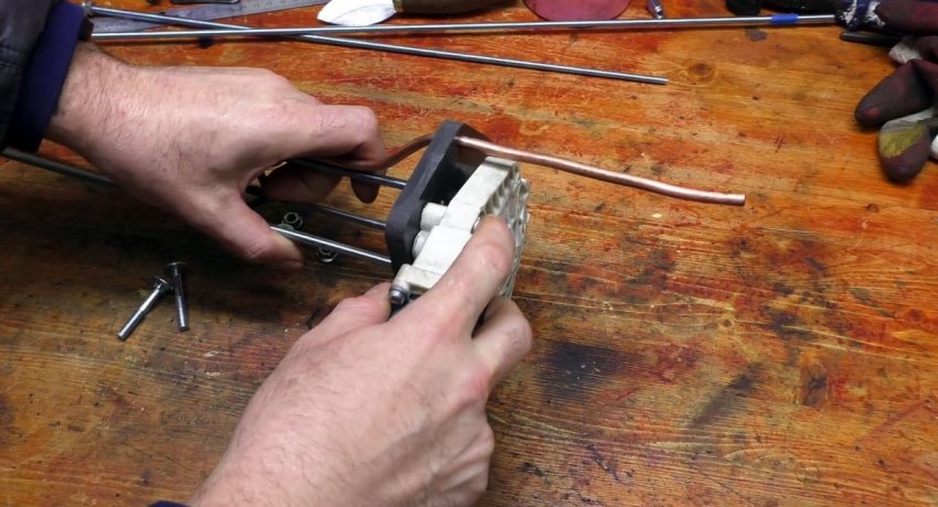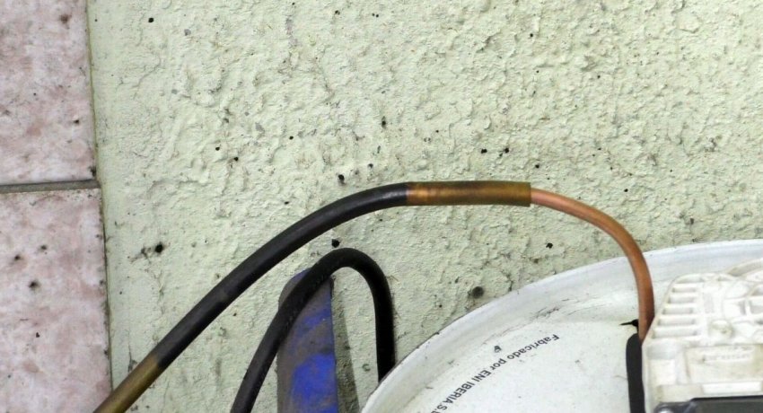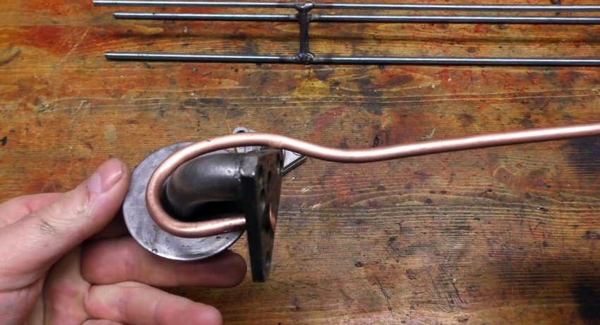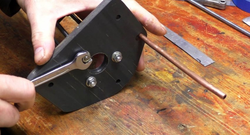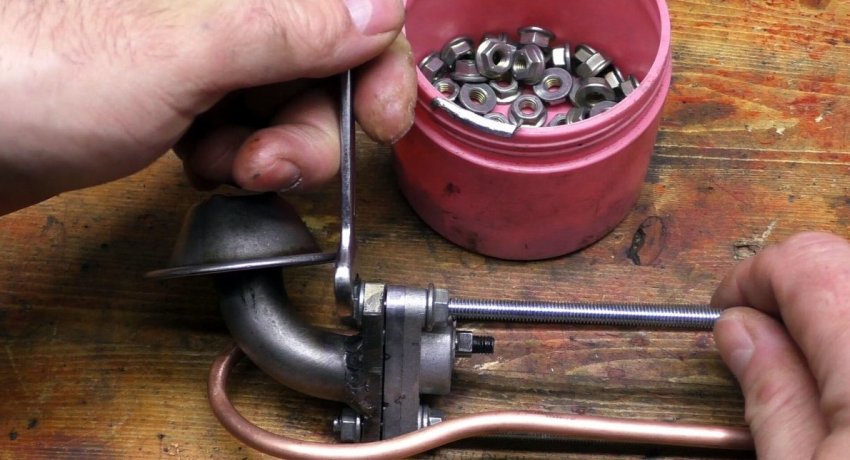 Из медной трубки 6 мм нужно выгнуть канал подачи масла. На одном конце ее необходимо развальцевать. Она вставляется в плиту. Для этого отверстие должно иметь фаску. Трубка выворачивается в сторону электропривода на выход из емкости.