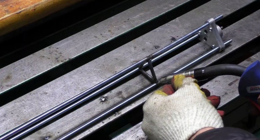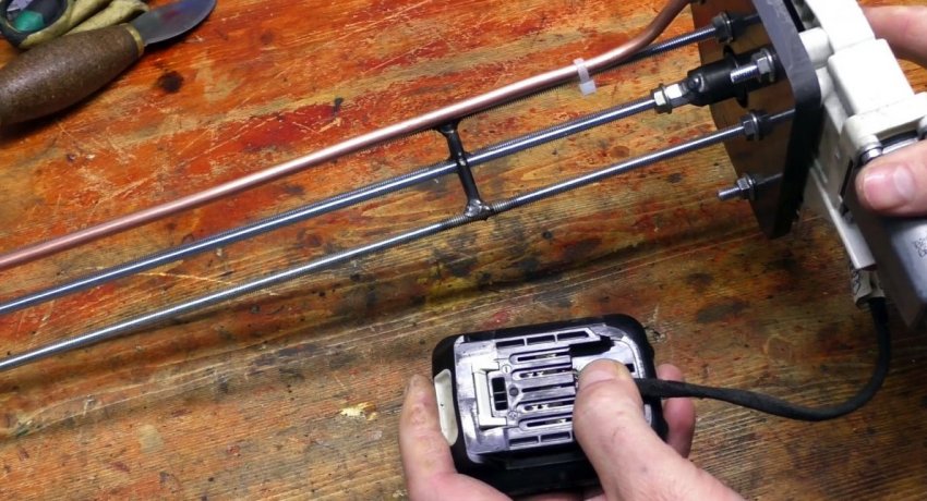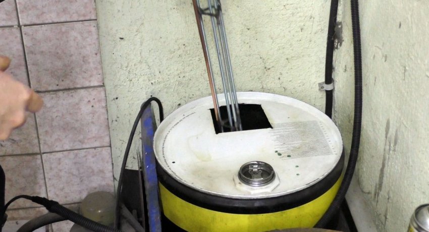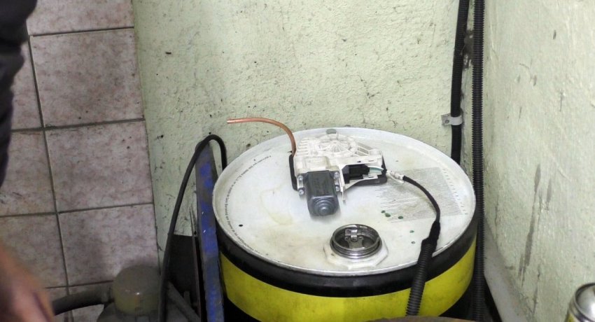Конструкция подразумевает опускание масляного насоса от скутера в емкость с маслом. От него будет идти длинный вал на поверхность к мотор-редуктору стеклоподъемника, который послужит электроприводом системы. Чтобы это реализовать, нужно сварить из трех шпилек М6 и перемычек каркас, на одном конце которого будет крепиться насос, а на втором электромотор. Длина шпилек для этого должна соответствовать глубине емкости с отработкой. Они свариваются треугольником под отверстия на маслонасосе.