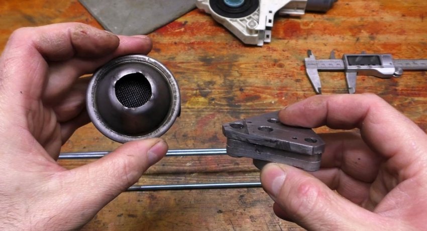Из толстой листовой стали нужно вырезать переходную плиту для масляного насоса. В ней сверлятся отверстия для забора и нагнетания масла, а также каркаса из шпилек. На забор нужно поставить сетку, чтобы внутрь не попала стружка, присутствующая в отработке.