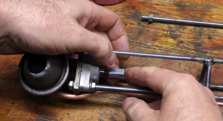 На край каркаса с помощью гаек устанавливаются и сжимаются между собой насос и переходная плита с трубкой. На вал маслонасоса накручивается удлиненная гайка. В нее вворачивается шпилька, которая передаст крутящий момент от мотор-редуктора.