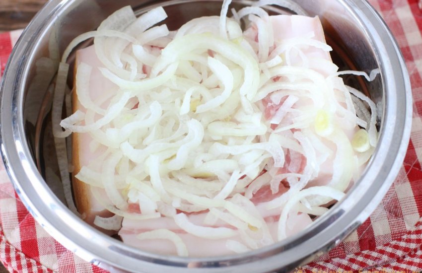 2. Репчатый лук нарезать средними кольцами и распределить их по кускам сала.