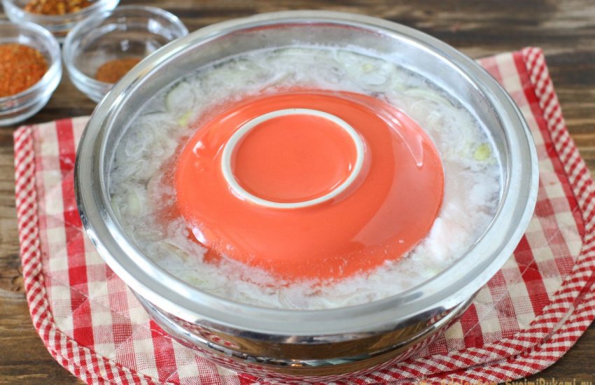 5. Накрыть куски блюдцем, чтобы они были полностью погружены в маринад – это важно, проследите за этим внимательно. Оставьте сало солиться на 2-3 суток в холодильнике.