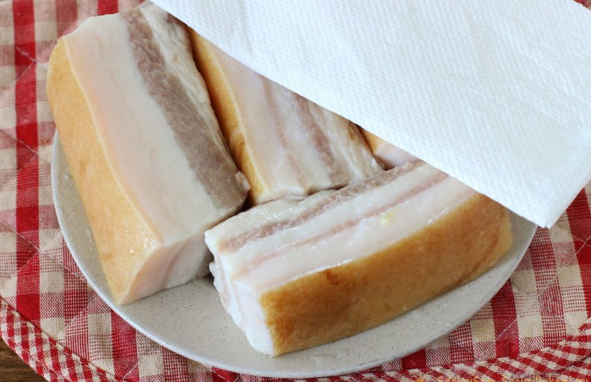 1. Сало или подчеревок зачистить ножом и хорошо протереть бумажными полотенцами, удаляя возможные загрязнения, далее нарезать кусок на квадраты или прямоугольники. Они должны быть такого размера, чтобы было можно компактно разместить их в посуду для маринования – пластиковую или из нержавейки либо в стеклянный бутыль.