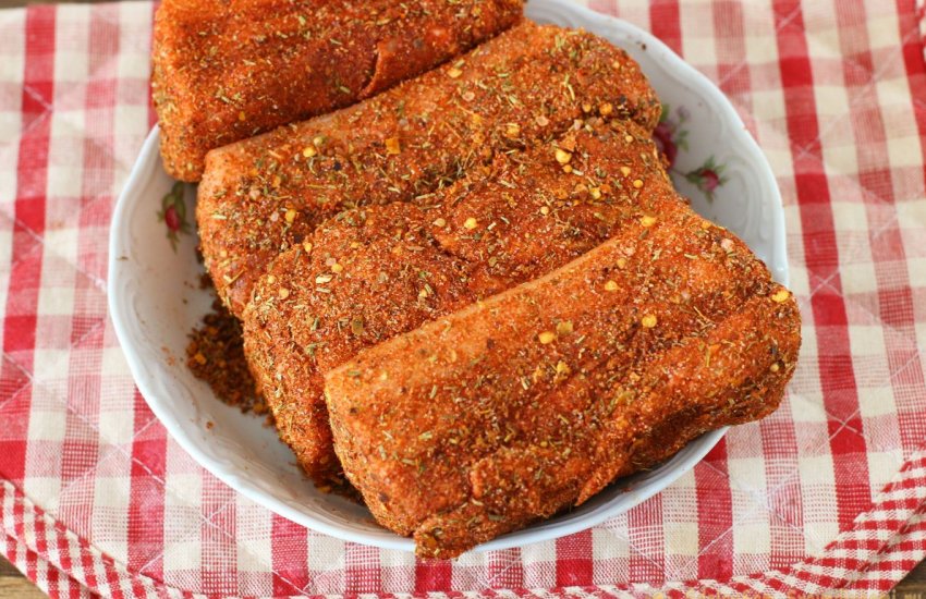 7. Смешать выбранные пряности на одном широком блюде с бортиками, обвалять каждый кусочек сала со всех сторон, крепко прижимая его к пряностям, стараясь «приклеить» их к липкой поверхности в один слой. Излишки лучше стряхнуть и использовать их для следующего кусочка.