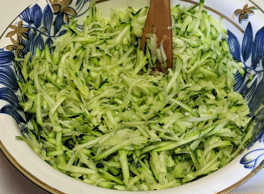 Кабачок трём вместе с кожурой (с кожурой только молодой кабачок) на крупную тёрку. Солим и оставляем на 15 минут пускать сок.
