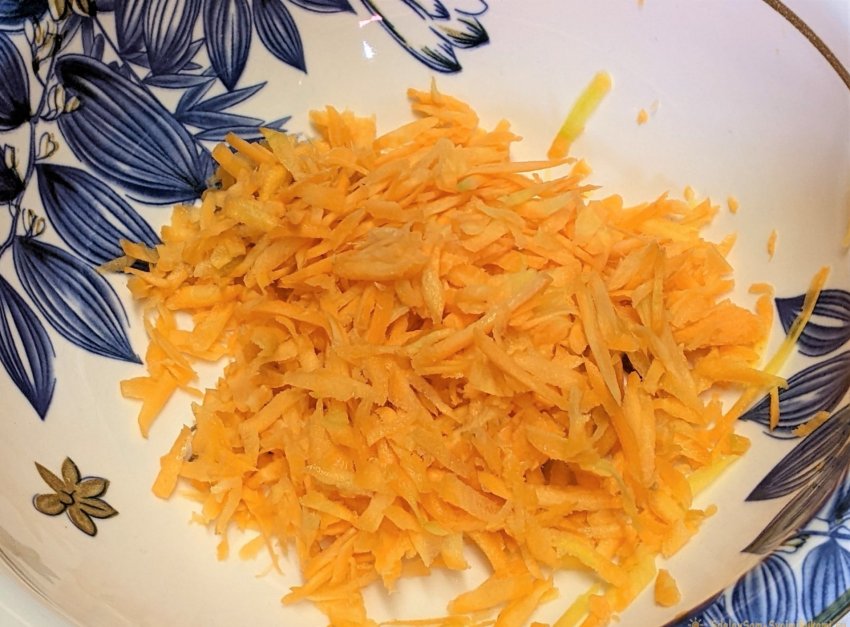 Затем добавляем к луку тёртую на крупную тёрку морковь и болгарский перец. Лучше взять красный яркий перец: так будет красивее выглядеть пицца. У меня же было только 2 зелёных перчика.