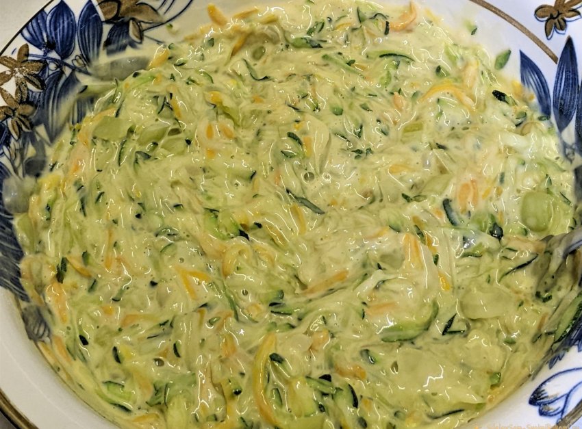 Кабачок тщательно отжимаем, смешиваем с тестом кабачок и остальные овощи. Можно добавить пряности.