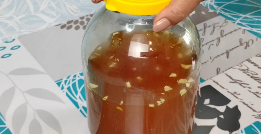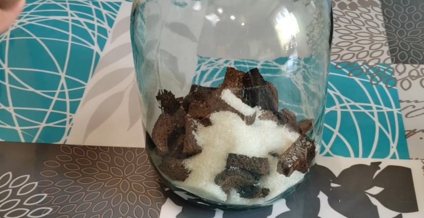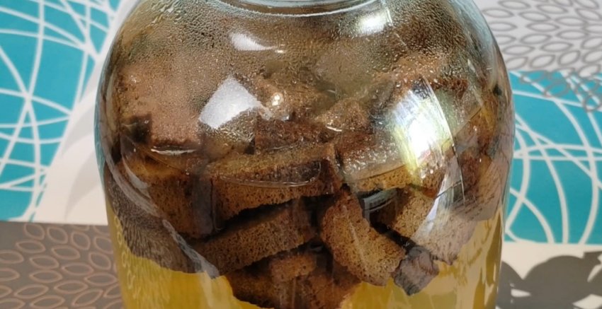Заливаем содержимое банки немного стуженным кипятком с температурой примерно около 70оС в количестве 2,7 литра, чтобы при брожении квас не переливался через верх банки. Тщательно перемешиваем ингредиенты в емкости, в первую очередь, чтобы полностью растворился сахар.