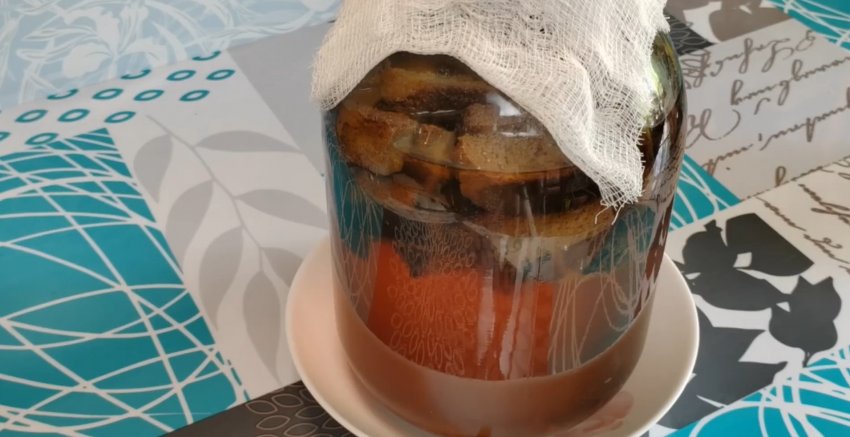 Сверху горлышко банки накрываем марлей, сложенной в несколько слоев, и ставим посуду в тарелку на всякий случай. Если квас при брожении пойдет верхом, то он окажется в тарелке. Ставим наш полупродукт в теплое место примерно на трое суток.