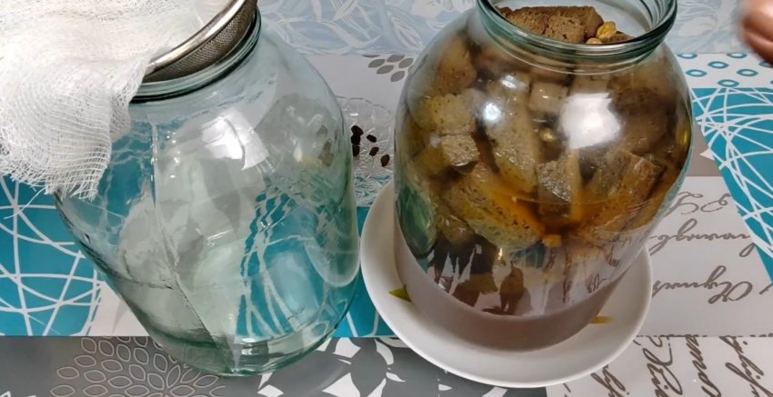 За это время процесс брожения обычно заканчивается. Приступаем к процеживанию кваса через сито, в которое укладываем марлю в несколько слоев. От оставшихся в первой банке сухарей отделяем третью часть и используем ее в качестве закваски для приготовления следующих порций кваса.