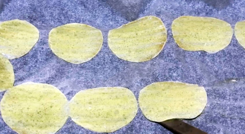 Аккуратно снимаем верхний слой бумаги. Поддеваем ножом каждый кусочек и укладываем на тарелку. Вкуснейшие чипсы готовы. Хрустящие, тонкие, приготовленные из натуральных продуктов, очень вкусные и действительно похожие на «Принглз». Обязательно попробуйте и приятного аппетита.
