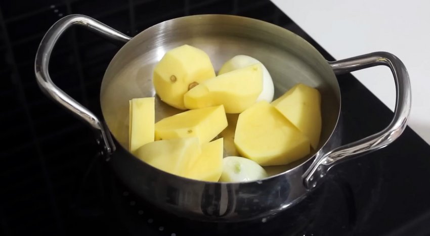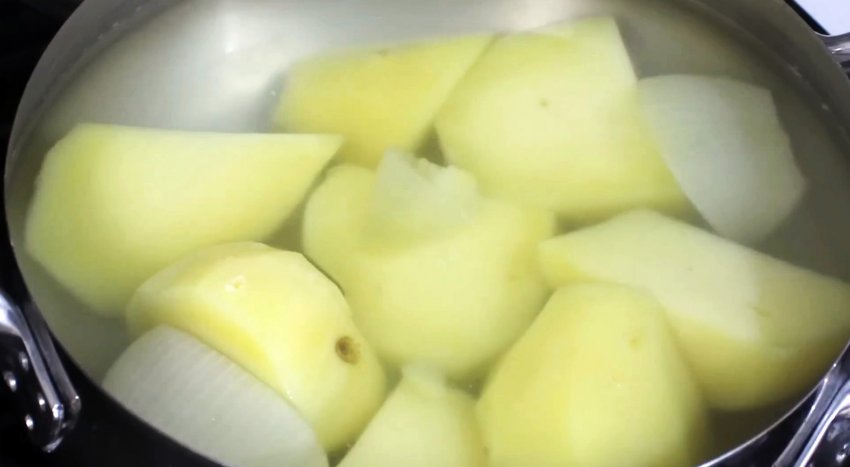 Нарезаем овощи кусочками, кипятим воду. Выкладываем картофель и лук одновременно. Варим на среднем огне, проверяя готовность зубочисткой, ножом или вилкой.