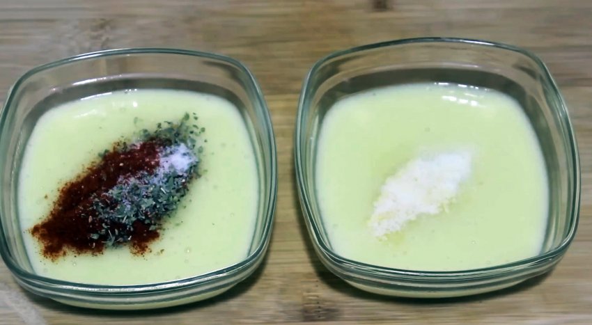 Делать чипсы мы будем с двумя разными вкусами. Делим смесь пополам, выливая в разные емкости. В первую чашку смеси добавляем красный молотый перец, тимьян и соль. Во вторую чесночный порошок и соль. Получатся острые и чесночные чипсы. Хорошо перемешиваем.