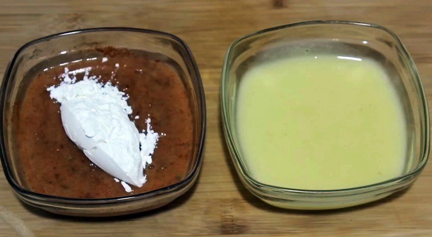 В каждую порцию добавляем 2 ложки кукурузного крахмала и снова перемешиваем. Консистенция должна быть похожа на жидкую сметану. В зависимости от размера картофелины количество крахмала и приправ может меняться. Не допускайте, чтобы смесь была слишком жидкой.