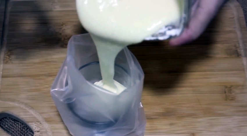 Заполняем получившейся массой кондитерский мешок или шприц. Можно воспользоваться простым плотным полиэтиленовым пакетом, обрезав затем его кончик.