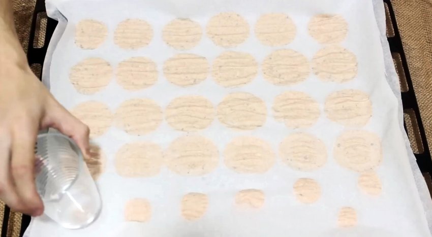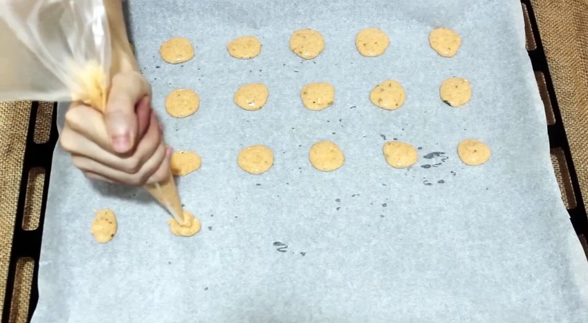 Выкладываем на противень пергаментную или пекарскую бумагу и выдавливаем небольшое количество смеси равноудаленно друг от друга.