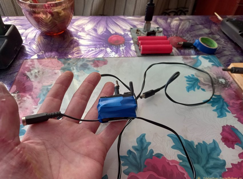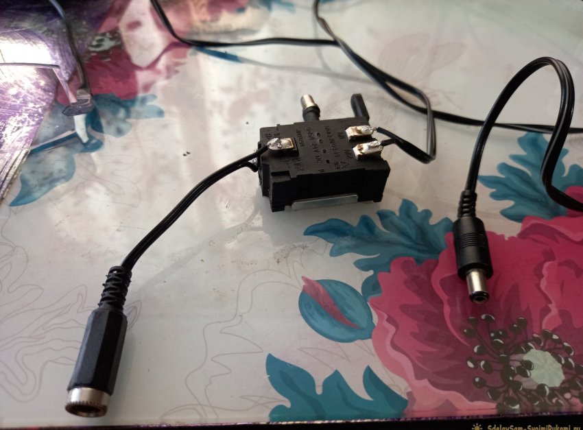 Разъем «мама» припаиваем коротким проводом к входу. Штекер «папа» к выходу, на длинный провод. На разъеме и штекере подобного типа, внутренний контакт всегда идет на плюс, а внешний – на минус. После пайки необходимо проверить, все ли правильно припаяно.